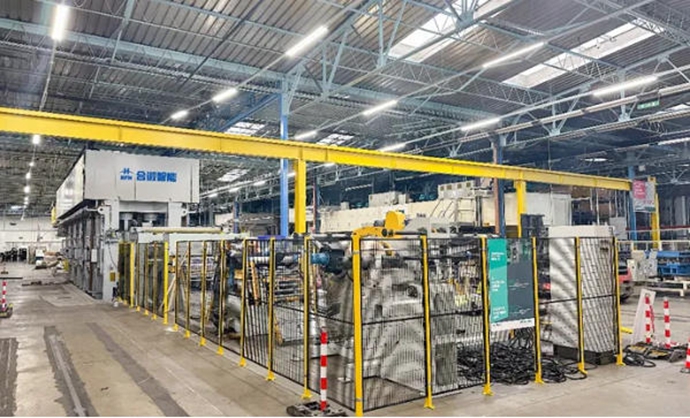 2025年11月,合锻智能自主研制的全自动高速液压机冲压生产线欧洲项目,实现关键性能指标稳定运行并通过当地第三方安全认证。整线由多台高速伺服液压机、多套倍速传送机械手及开卷校平自动线组成,液压机搭载伺服控制系统,兼具安全可靠特性,整线节拍小于 8.5秒,同步实现低噪音、节能优势,标志着该系列液压机生产线及关键技术实现成熟应用。